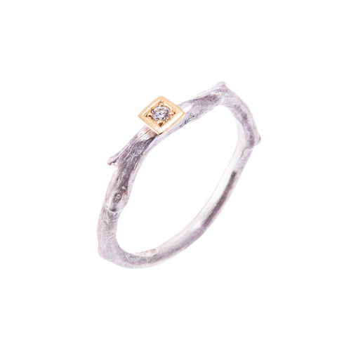 Organic Silver Ring Set with a Diamond in a Gold Square