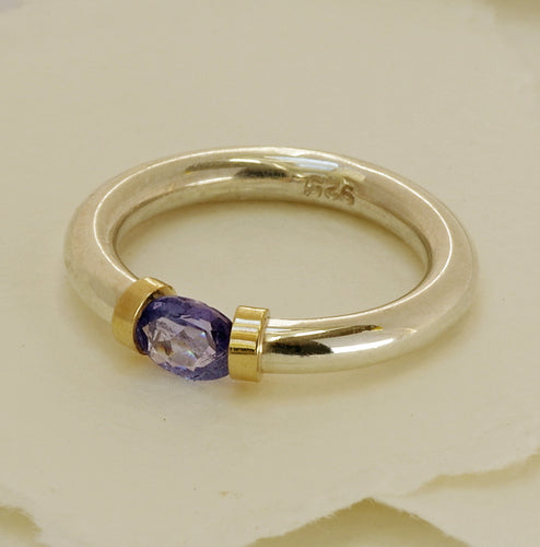 Tanzanite Gemstone In A Polished Silver Band With Gold Detail