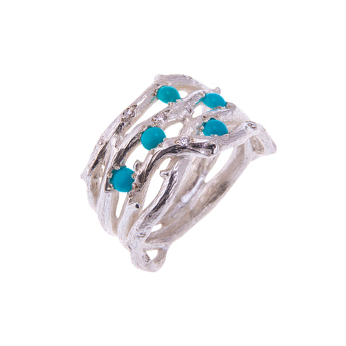 Sterling Silver Organic Ring Set With Small Diamonds and Natural Turquoise