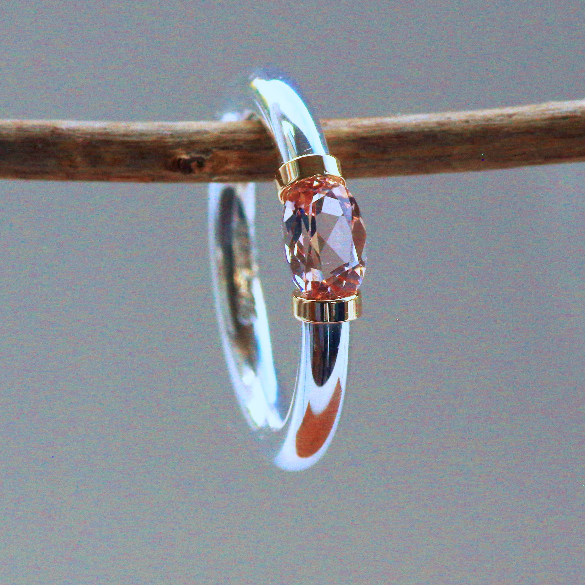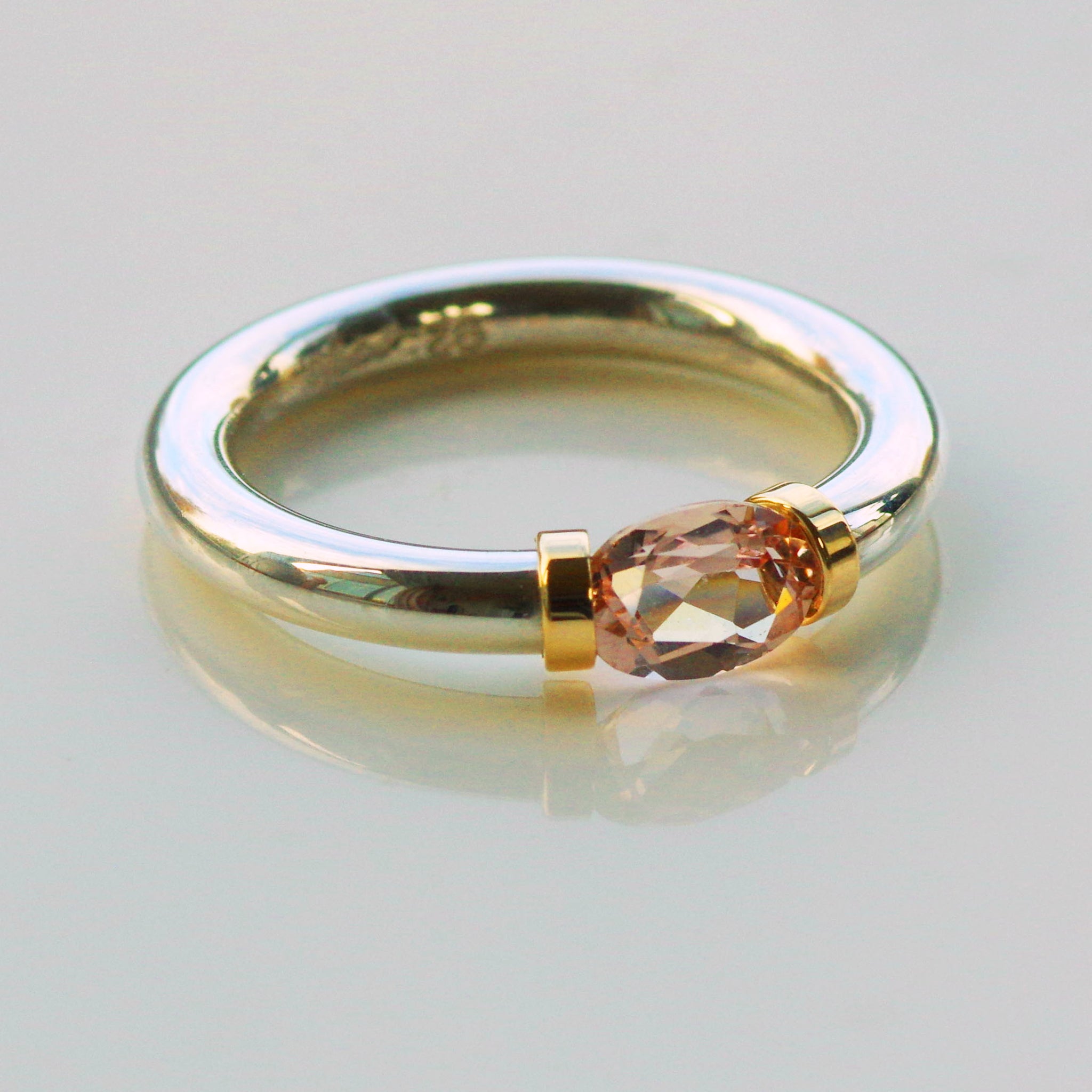 Morganite is a cool pink stone chosen for its chilled out hues, and it’s easy to pair with various metals while still looking good. It’s a lot of fun for me to work with because of this, and a tension setting is an obvious choice for this stone because it allows the gem to be held above the band and to stand proud of it, so it’s a lot easier to admire its colours without it getting lost or blending in with the setting. The tension set ring is a unique type that places all the pressure on the setting rather than the band, allowing the setting to be the focus of attention, which can be a real benefit for more subtle stones or stones that do best when exposed to a lot of light. Sterling Silver looks great when paired with this gem, and the 9 carat gold accents on this ring’s shoulders work really nicely with its