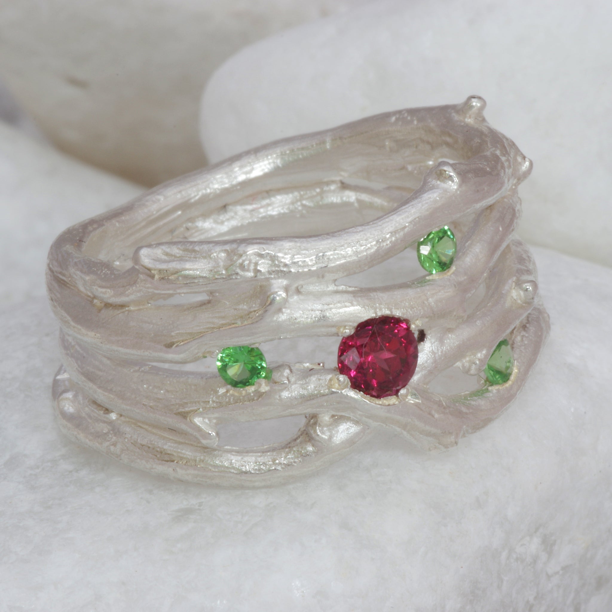 An eye catching four strand cocktail ring, cast from pieces of rose root, and set with three rare green Tsavorite garnets, and one Rhodalite garnet.